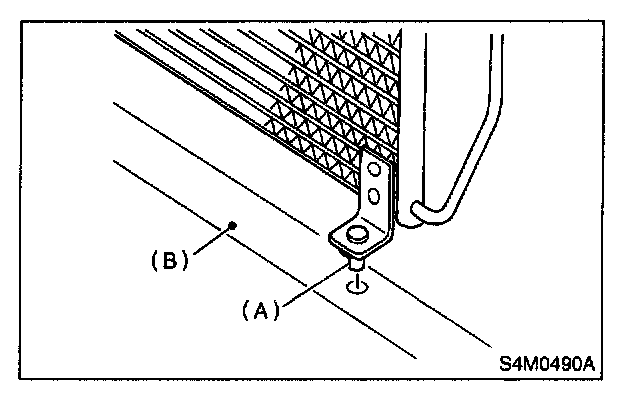 CAUTION: Replace O-rings on hoses or pipes with new ones, and then apply compressor oil. Confirm that lower guide (A) of condenser has been fitted into holes on radiator panel (B).