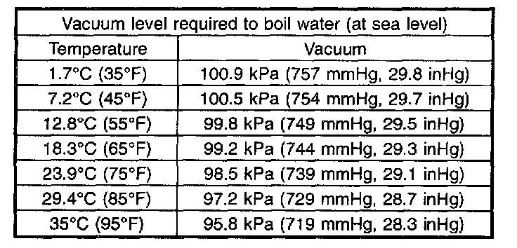 The list shows the vacuum values necessary to boil water in various temperature. In addition, the vacuum levels indicated on the gauge are approx. 3.3 kPa (25 mmHg, 0.98 inHg) lower than those measured at 304.8 m (1,000 ft) above sea level.