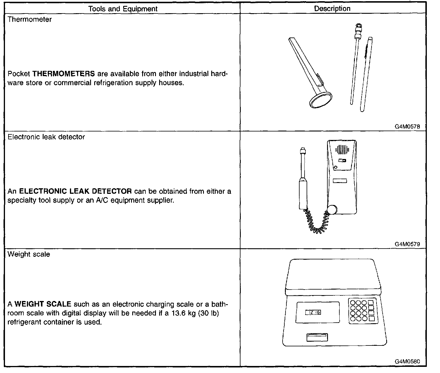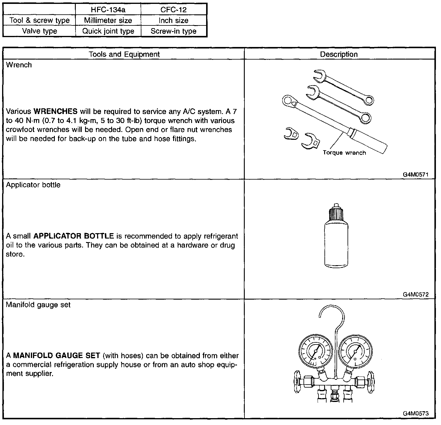 In order to help prevent mixing HFC-134a and CFC-12 parts and liquid, the tool and screw type and the type of service valves used are different. The gas leak detectors for the HFC134a and CFC-12 systems must also not be interchanged.
