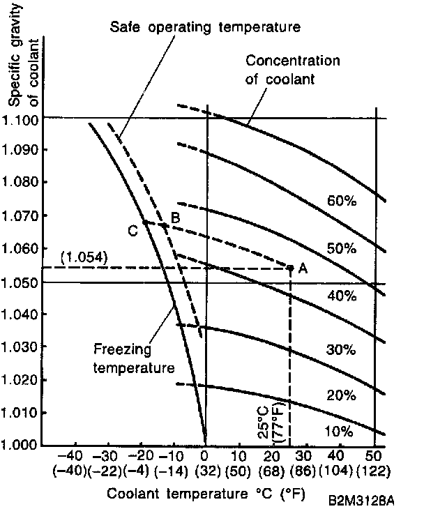 If the coolant temperature is 25°C (77°F) and its specific gravity is 1.054, the concentration is 35% (point A), the safe operating temperature is -14°C (7°F) (point B), and the freezing temperature is -20°C (-4°F) (point C).