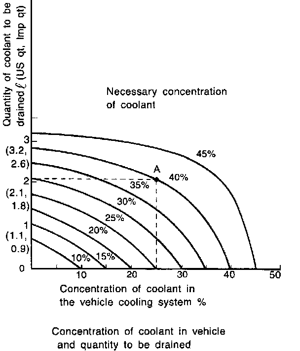 Assume that the coolant concentration must be increased from 25% to 40%. Find point A, where the 25% line of coolant concentration intersects with the 40% curve of the necessary coolant concentration, and read the scale on the vertical axis of the graph at height A. The quantity of coolant to be drained is 2.1 liters (2.2 US qt., 1.8 Imp qt.). Drain 2.1 liters (2.2 US qt., 1.8 Imp qt.) of coolant from the cooling system and add 2.1 liters (2.2 US qt., 1.8 Imp qt.) of the undiluted solution of SUBARU coolant.