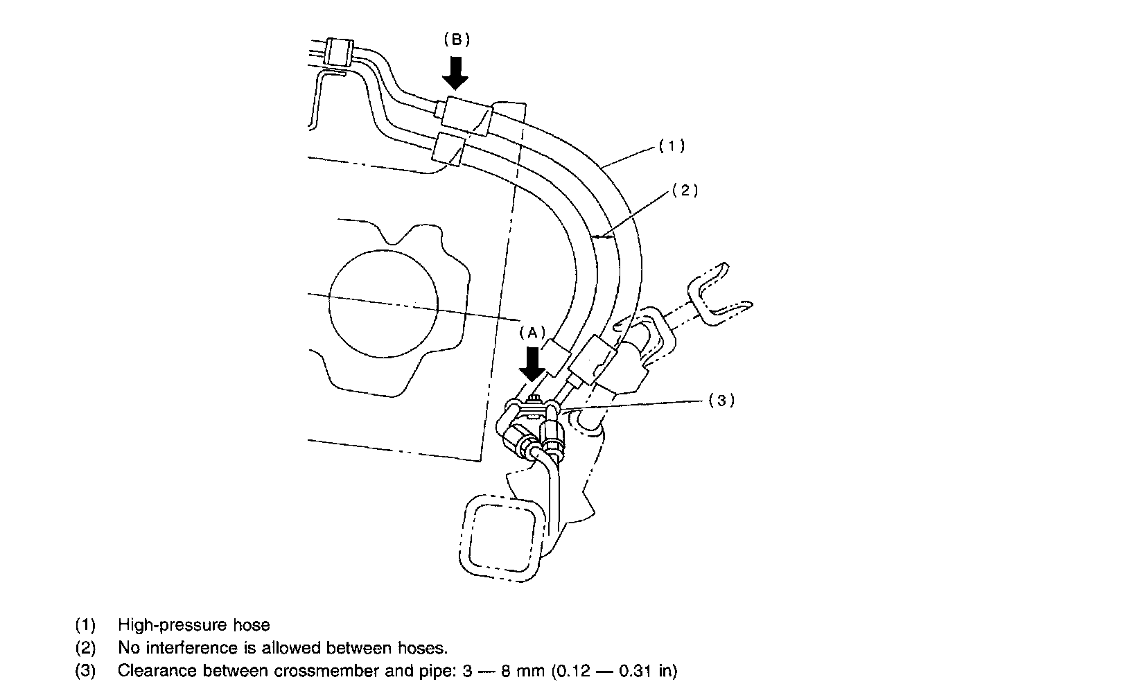 2. Check that clearance between cruise control pump and power steering hose is at least 10 mm (0.39 inch). If it is not, bend section (B) down until a clearance of at least 10 mm (0.39 inch) is obtained