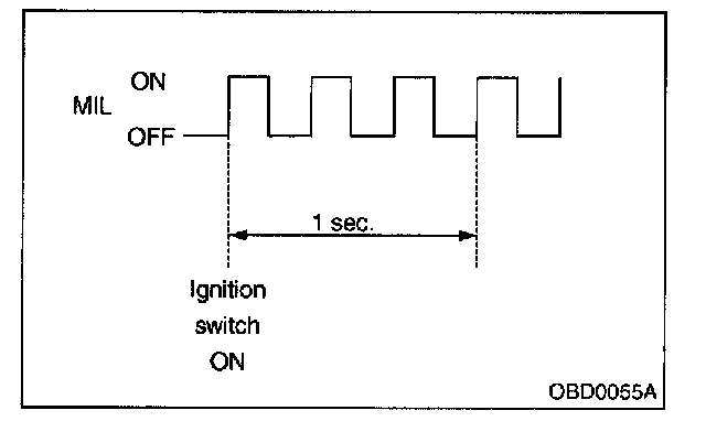 4. When ignition switch is turned to ON (engine off) or to "START" with the test mode connector connected, the MIL blinks at a cycle of 3 Hz.