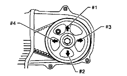 ^ To set #3, #2 and #4 cylinder pistons to their top dead centers on compression stroke, turn crankshaft pulley clockwise 900 at a time starting with arrow mark on left-hand camshaft sprocket facing up.