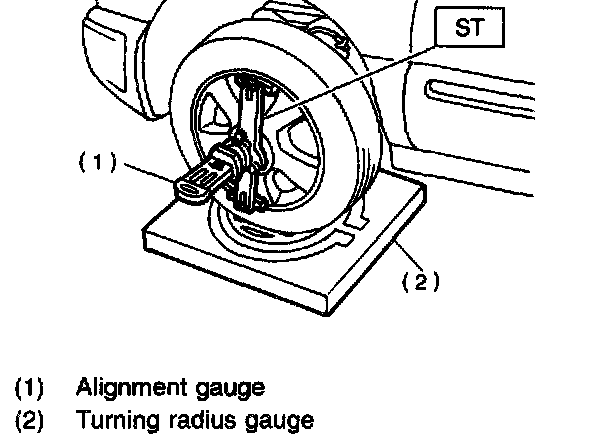 1) Place front wheel on turning radius gauge. Make sure ground contacting surfaces of front and rear wheels are set at the same height.