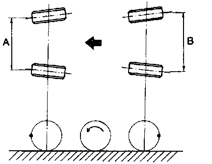 4) Measure distance "B" between left and right marks. Toe-in can then be obtained by the following equation:
