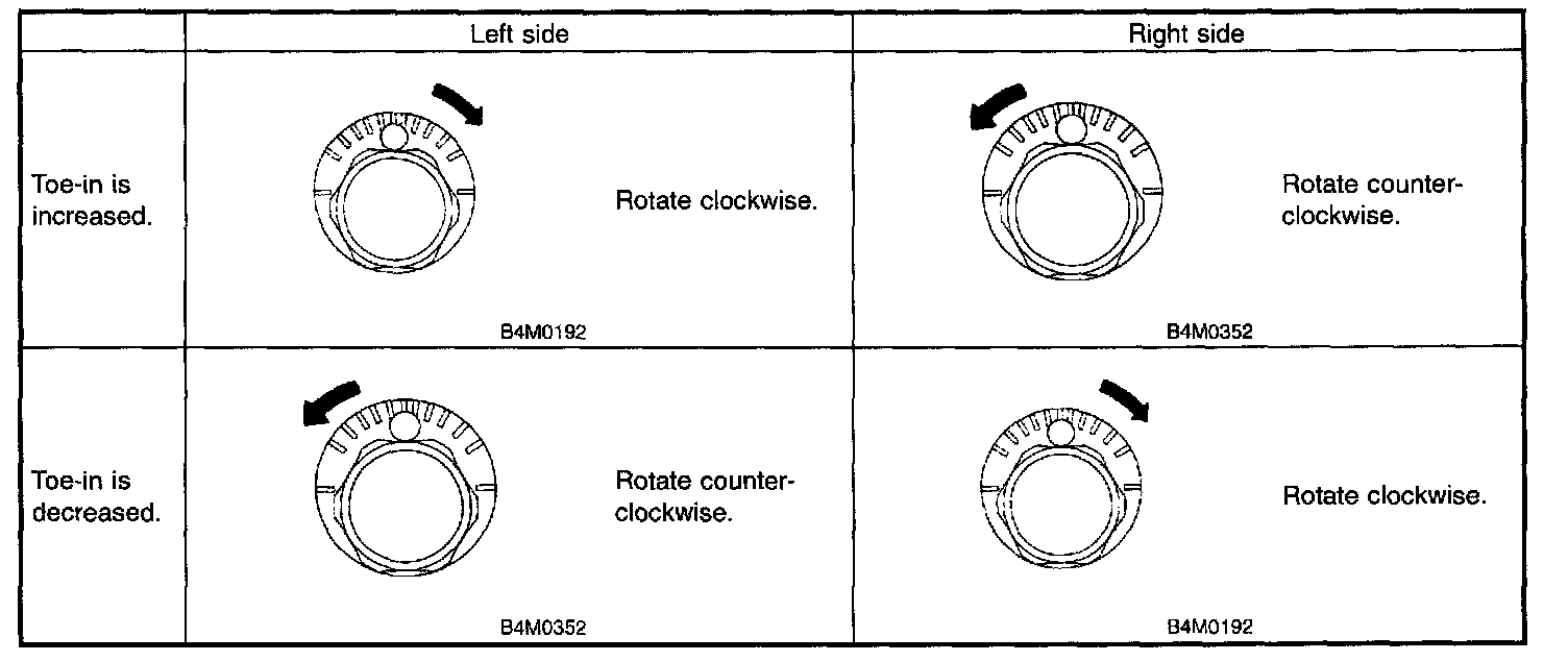 2) When one rear wheel is adjusted in a toe-in direction, adjust the other rear wheel equally in toe-out direction, in order to make thrust angle adjustment.