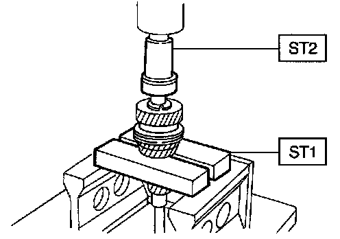 6. Using ST1 and ST2, install the 5th gear thrust washer and 5th needle bearing race onto the rear section of transmission main shaft.
