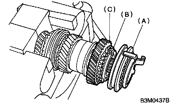 2. Install 3rd drive gear, outer baulk ring, synchro cone, inner baulk ring, sleeve and hub assembly for 3rd needle bearing on transmission main shaft.