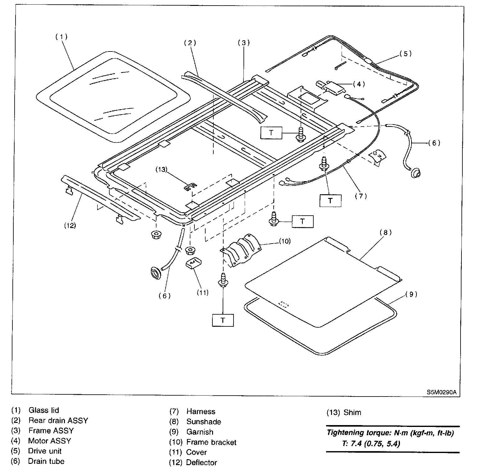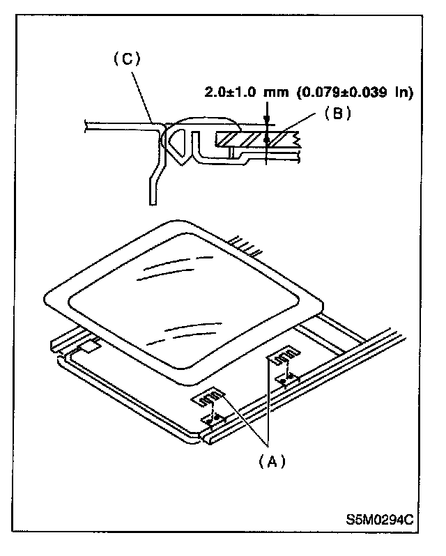 (max: two pieces) shims (A) (standard: two pieces) between sunroof lid (B) and roof panel (C).