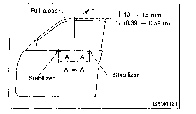 3. Lower door glass 10 to 15 mm (0.39 to 0.59 in) from fully closed position. While applying outward pressure of 44.1 ± 5.0 N (4.5 ± 0.51 kgf, 9.9 ± 1.12 lb) (F) to upper edge of glass above midpoint of two outer stabilizers, press inner stabilizer until it just touches the glass, then secure it.
