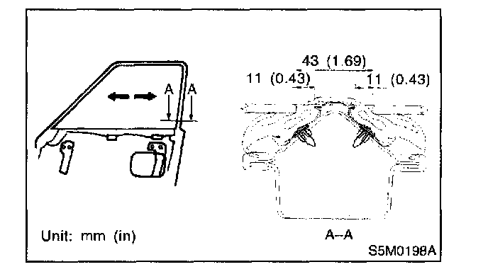 4. For adjustment of clearance between front and rear glasses, loosen nuts (A), and move glass sash back and forward until clearance becomes the value shown.