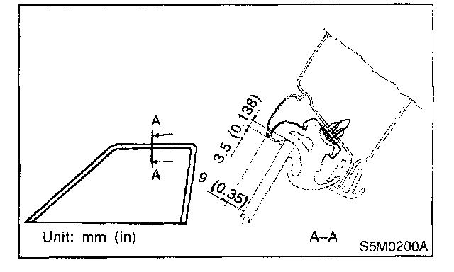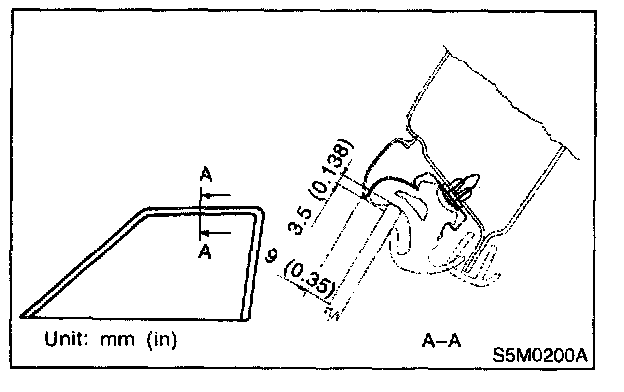 8. After stabilizer adjustment, carry out glass crimp adjustment. First, visually ensure positional relationship between retainer & molding and glass of the roof side, and then begin with rear sash adjustment. Adjust two adjusting bolts alternately step by step to obtain dimensions shown (cross-section A).