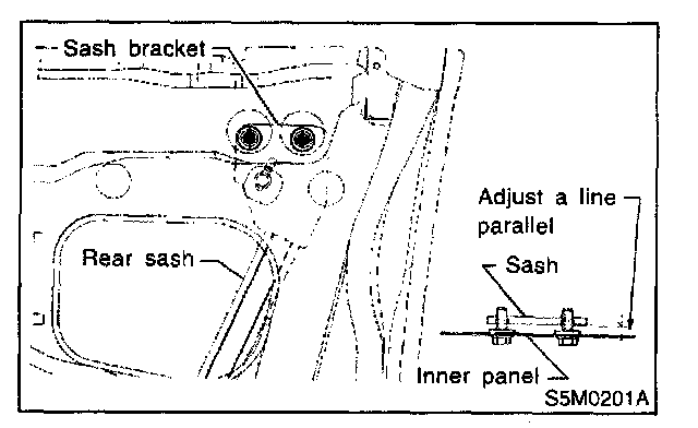 CAUTION: Do not tilt sash bracket to inner panel during adjustment. Otherwise smooth regulator operation cannot be achieved.