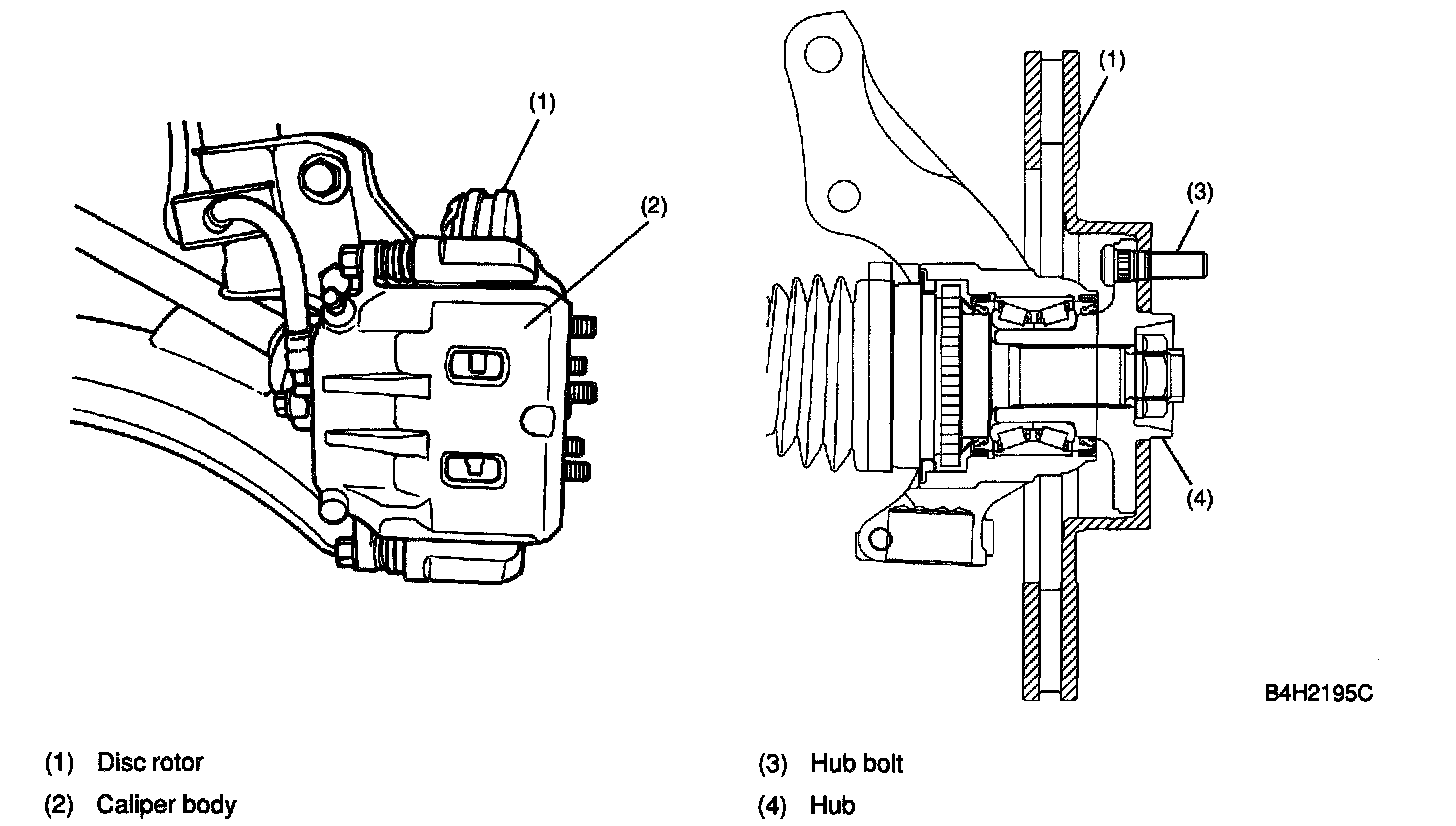 A wear indicator is provided on the inner disc brake pads. When the pad wears down to 1.5 mm (0.059 inch) the tip of the wear indicator comes into contact with the disc rotor, and makes a squeaking sound as the wheel rotates. This alerts the driver to the situation.