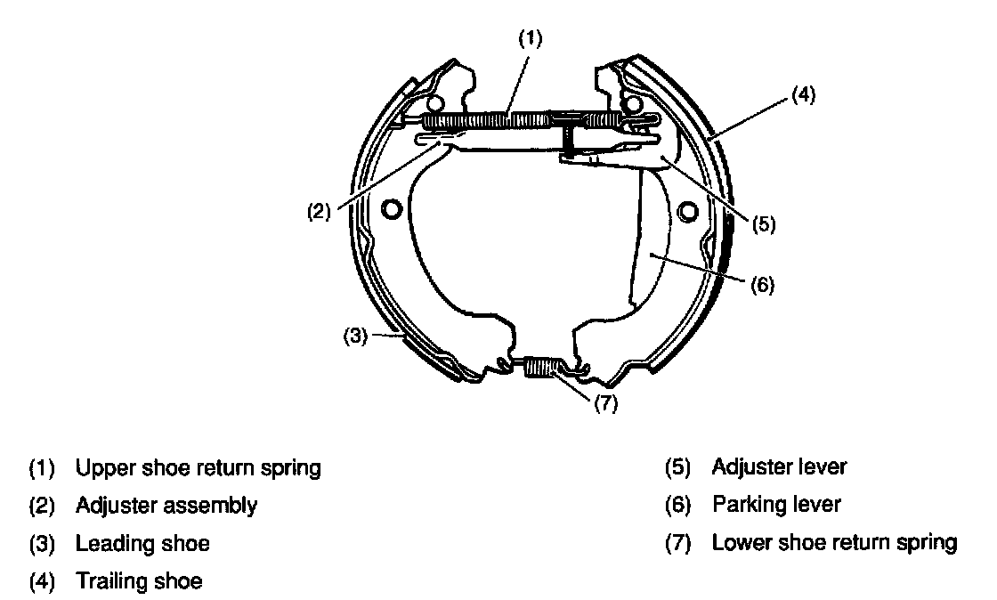 ^ The rear drum brakes are of a leading-trailing shoe type. When fluid pressure is applied to each wheel cylinder, the piston expands the leading and trailing shoes. During expansion of the shoes, the lower shoe return spring joint acts as a pivot. The shoes come in contact with the inner surface of the drum, producing braking action.