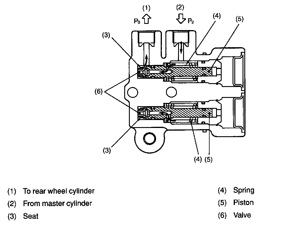 Under this condition, fluid pressure "P3" to the rear wheel cylinders is equal to fluid pressure "P2" from the master cylinder.