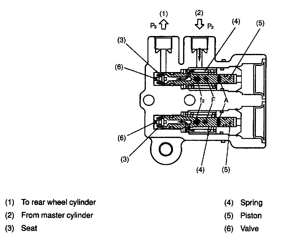 When pressure "P2" increases to the split point pressure, force "f2" is generated. (Piston's cross sectional area "A" has been selected so that the force is generated starting with the split point pressure.) The pressure pushes the piston rightward, overcoming spring force "F". As a result, the valve seat moves together with the piston rightward and comes in contact with the valve, blocking the passage toward the rear wheel cylinders.
