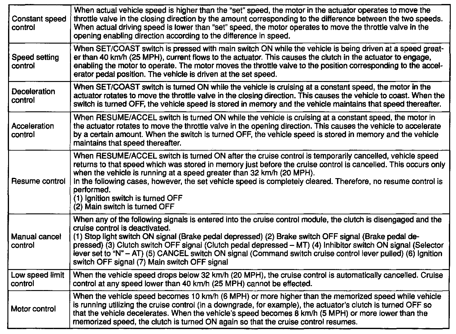 - When the driver has activated the system and made a desired speed setting, the cruise control module compares the actual vehicle speed detected by the speed sensor (MT) or transmission control module (AT) with the preset speed in the memory, then generates a signal according to the difference between the two speeds.