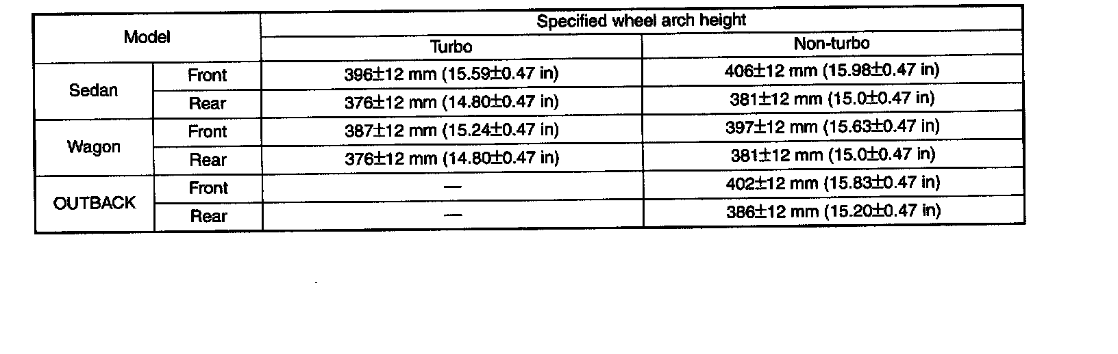 Toe-in: -1 ±2 mm (-0.039 ±0.079 inch)