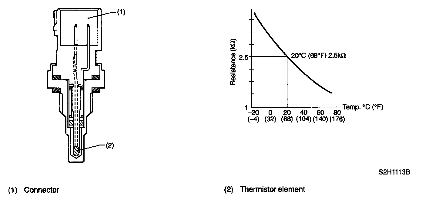 ENGINE COOLANT TEMPERATURE SENSORThe engine coolant temperature sensor is located on the engine coolant pipe. The sensor uses a thermistor whose resistance changes inversely with temperature. Resistance signals as engine coolant temperature information are transmitted to the ECM to make fuel injection, ignition timing, purge control solenoid valve and other controls.