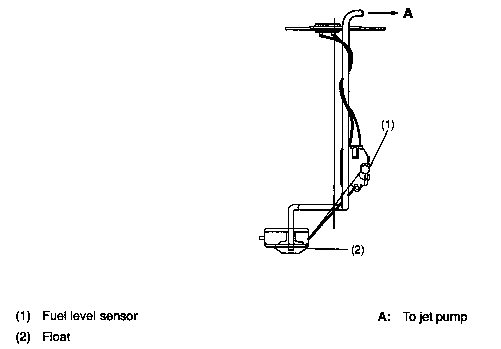 SUB-COMPARTMENT FUEL LEVEL SENSORThis sensor detects the level of the fuel in the sub-compartment (the compartment in which the fuel pump is not located) and acts as part of the fuel transfer line when the jet pump is in operation to maintain the fuel in both compartments at the same level.