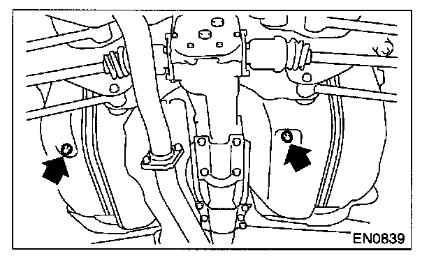 3. Drain the fuel from the fuel tank. Set a container under the vehicle and remove the drain plug from the fuel tank.