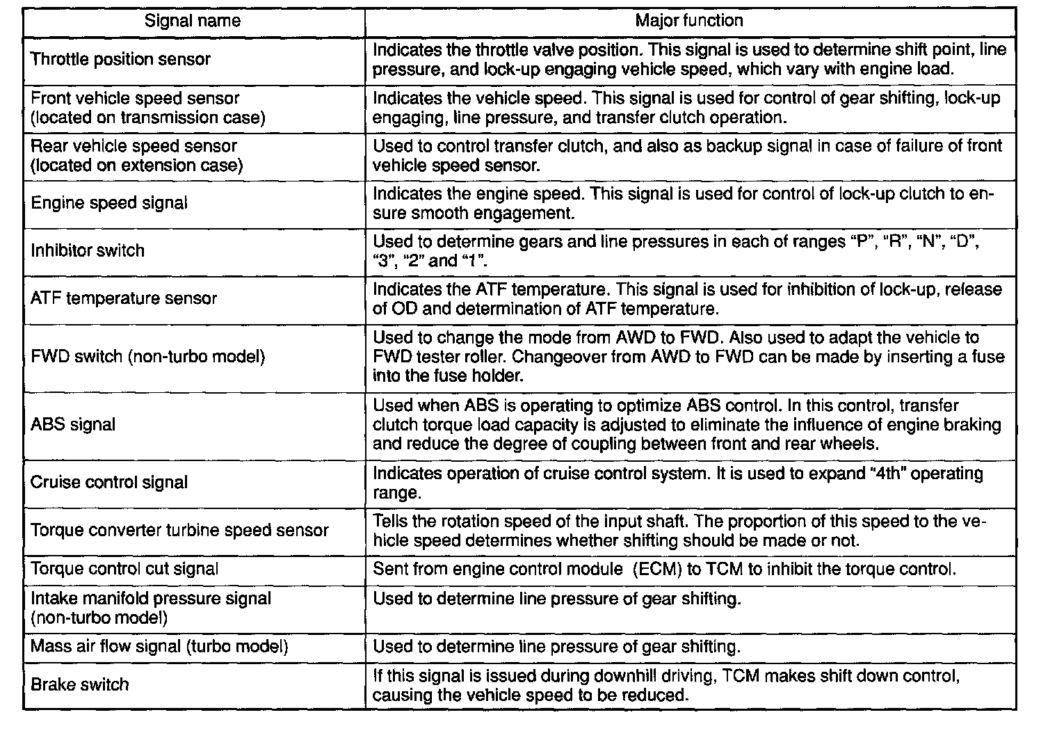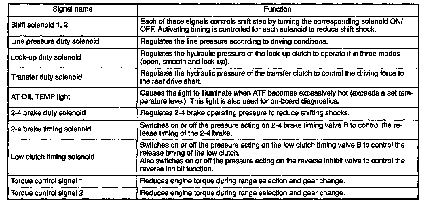 The electrohydraulic control system for the transmission and transfer consists of various sensors and switches, a transmission control module (TCM) and the hydraulic controlling units including solenoid valves. The system controls the automatic transmission operation, including gear shifting, lock-up clutch operation, line pressure, automatic control pattern selection ("Base" and "Power"), and gear-shift timing. It also controls the operation of the transfer clutch. The TCM determines vehicle operating conditions from various input signals and controls a total of eight solenoids (shift solenoids 1 and 2, low clutch timing solenoid, 2-4 brake timing solenoid, line pressure duty solenoid, lock-up duty solenoid, transfer duty solenoid, and 2-4 brake duty solenoid) by sending appropriate signals to them.