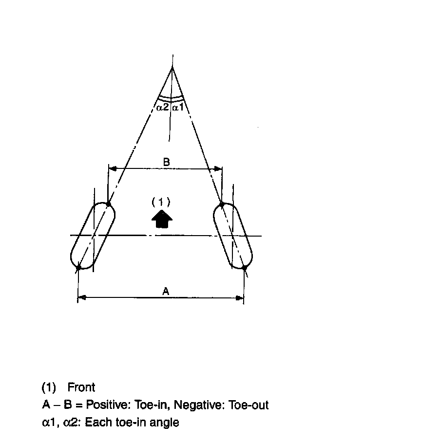^ Front and rear toe-ins and front camber can be adjusted. If the toe-in or camber tolerance exceeds specifications, adjust the toe-in and camber to the middle value of specification.