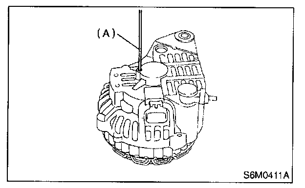 1. Pulling up brush: Before assembling, press the brush down into the brush holder with your finger and secure in that position by passing a 2 mm (0.08 in) diameter, 4 - 5 cm (1.6 - 2.0 in.) long wire (A) through the hole shown in the figure.