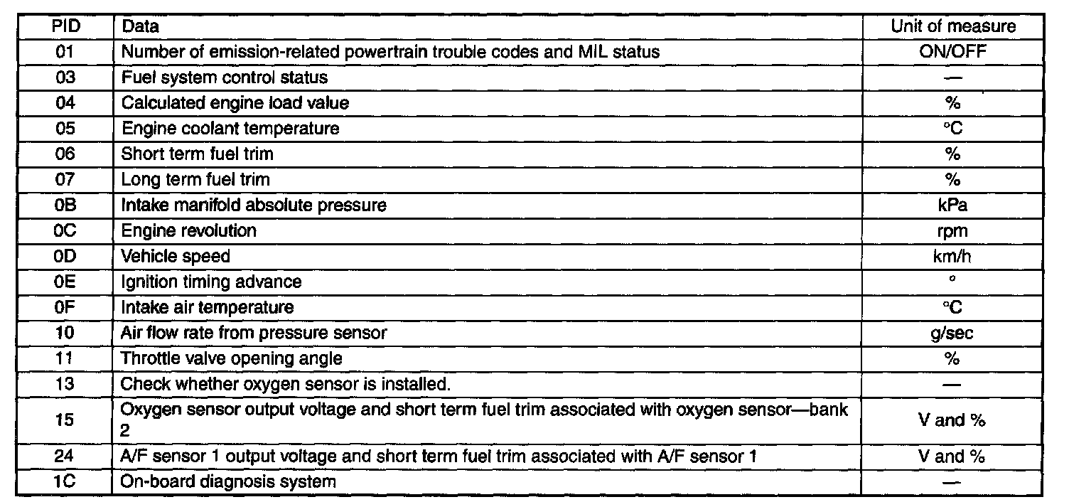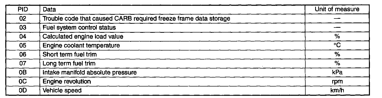 A list of the support data and PID (Parameter Identification) codes are shown in the above table.