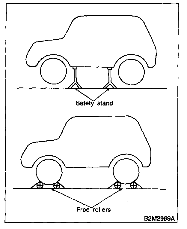 PREPARATION FOR THE INSPECTION MODERaise the vehicle using a garage jack and place on safety stands or drive the vehicle onto free rollers.