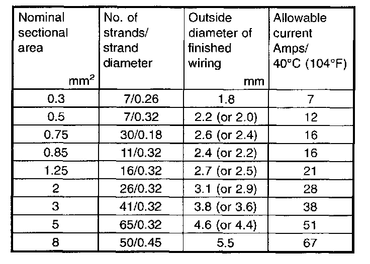 - The table lists the nominal sectional areas and allowable currents of the wires.