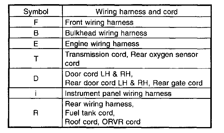 - Each connector number shown in the wiring diagram corresponds to that in the wiring harness. The location of each connector in the actual vehicle is determined by reading the first character of the connector (for example, a "F" for F8, "i" for i16, etc.) and the type of wiring harness.