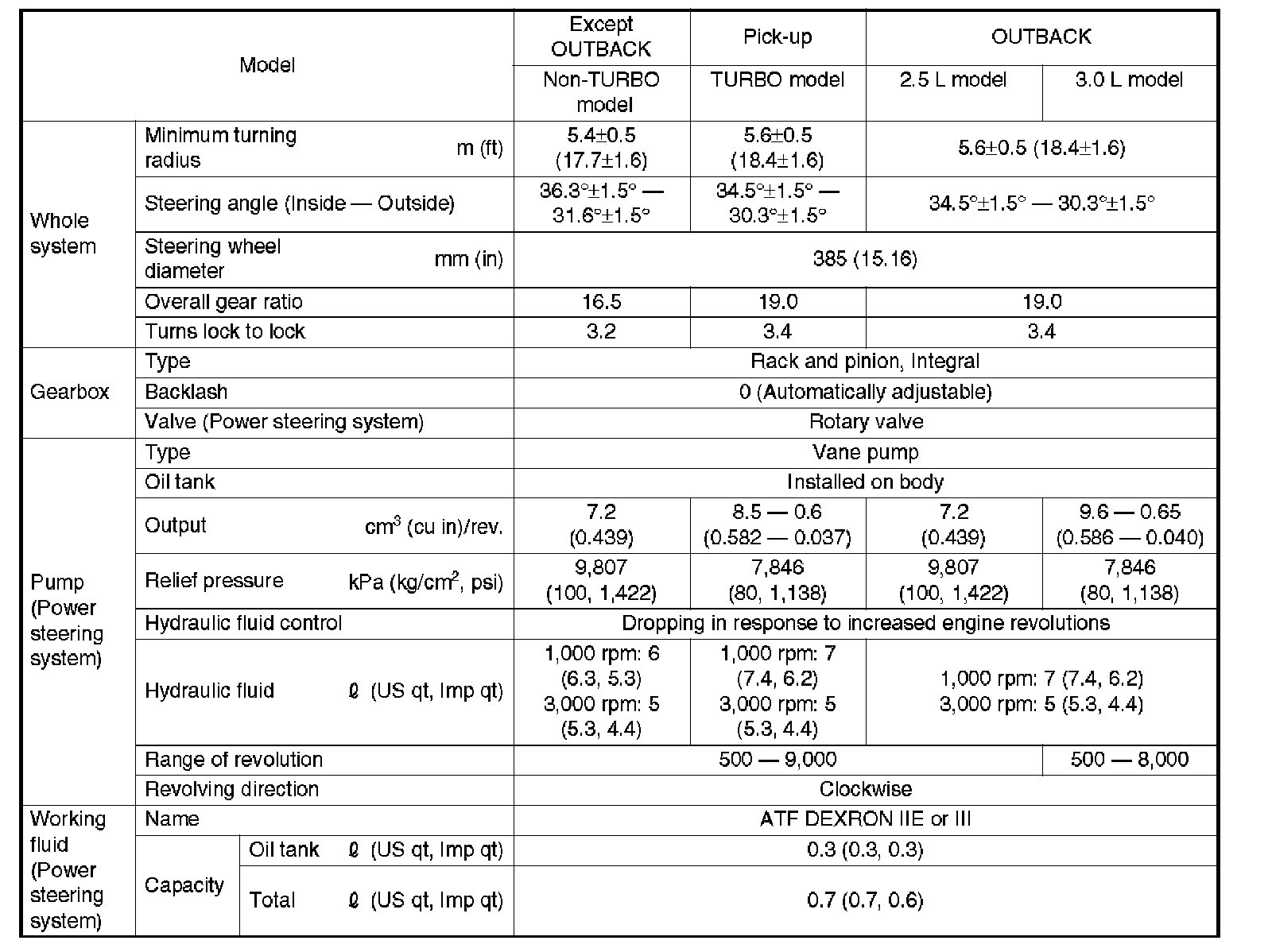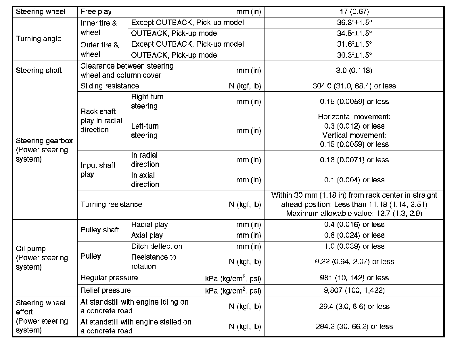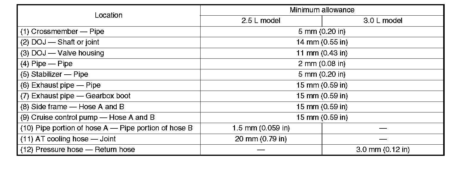 This table lists various clearances that must be correctly adjusted to ensure normal vehicle driving without interfering noise, or any other faults.