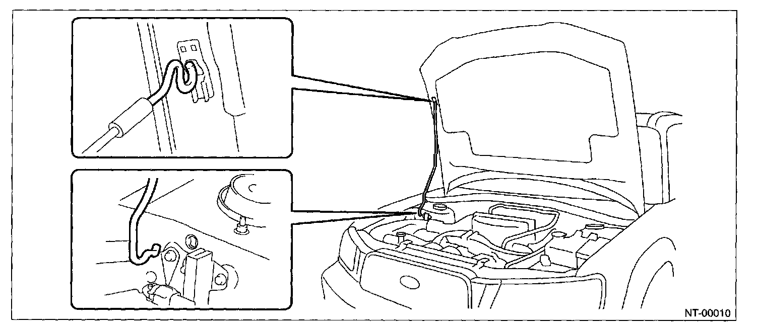 NOTE: Before setting the hood in this position, remove the windshield washer hose attaching clip from the hood.