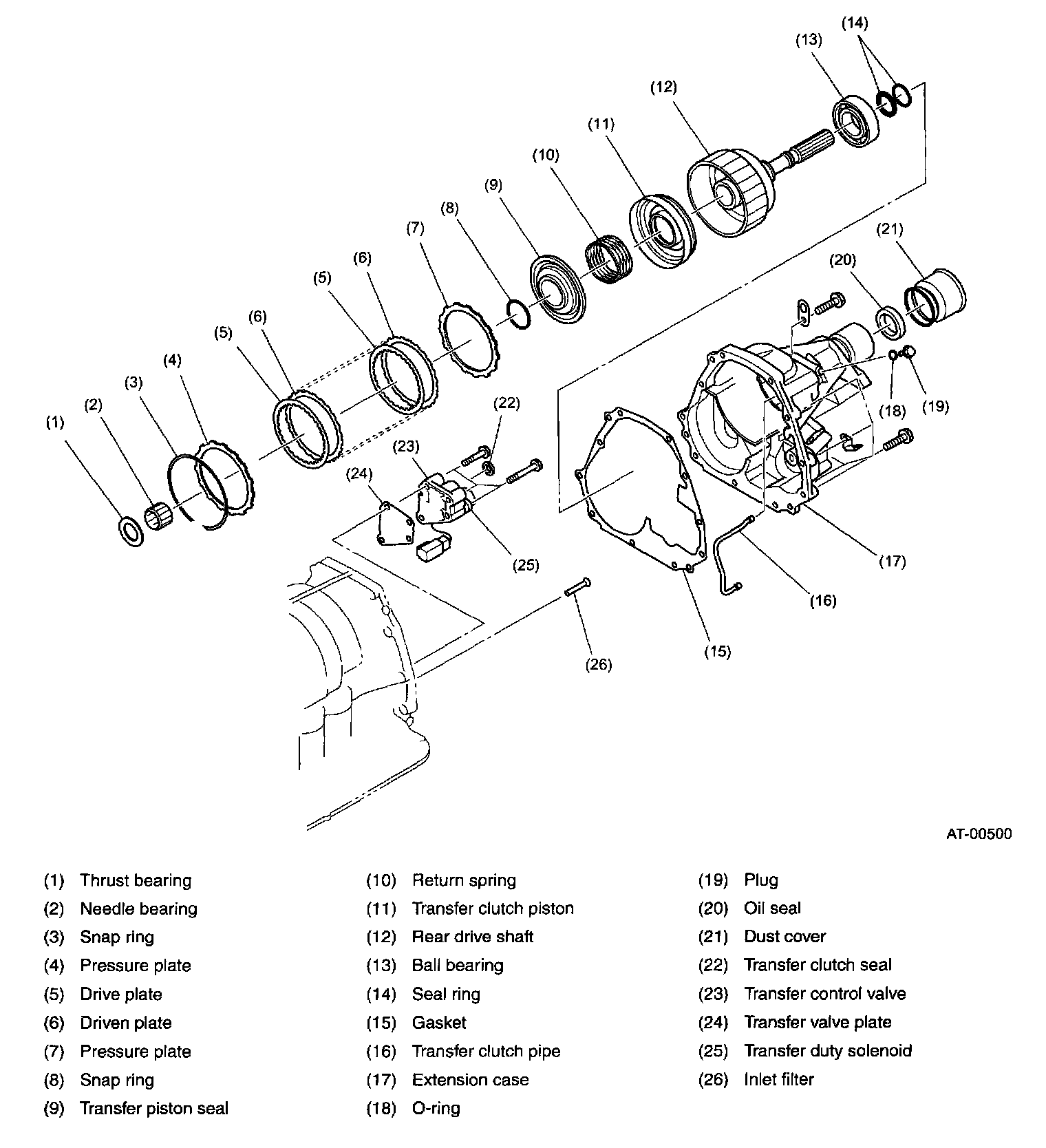 This All-Wheel-Drive (AWD) transfer system uses an electronically controlled multi-plate type transfer clutch. The clutch is controlled by the TCM through the transfer hydraulic pressure control unit which consists of a duty-cycle-controlled solenoid valve and is located at the rear of the automatic transmission section together with the vehicle speed sensor.