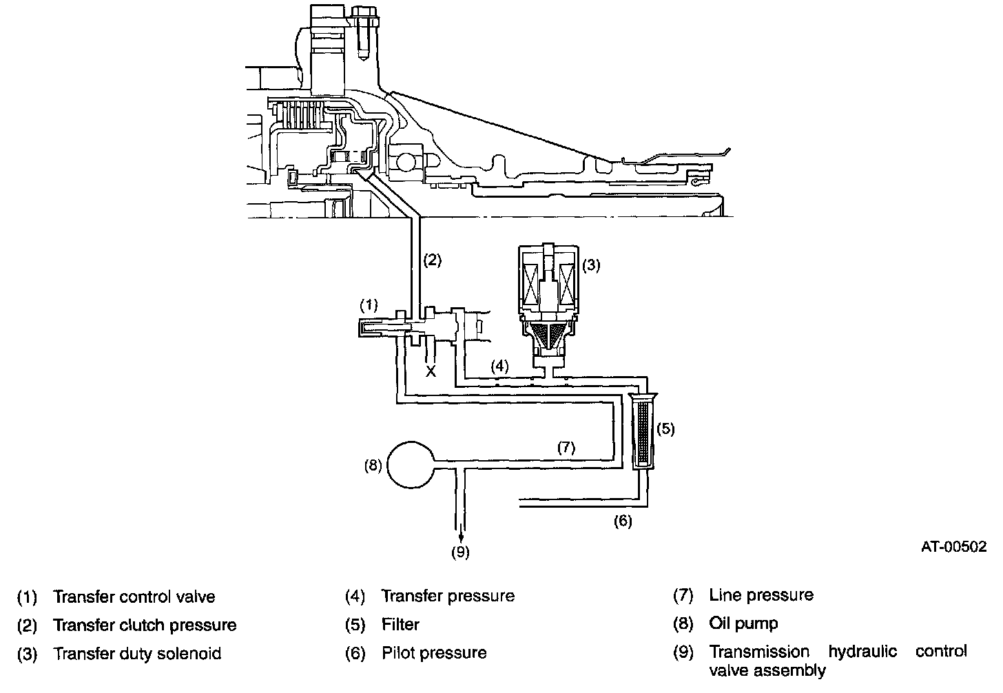 The transfer duty solenoid adjusts the pilot pressure of the transfer clutch valve depending on the signals from the TCM. The transfer clutch valve in turn modulates the line pressure into the transfer clutch pressure before it is applied to the clutch piston.