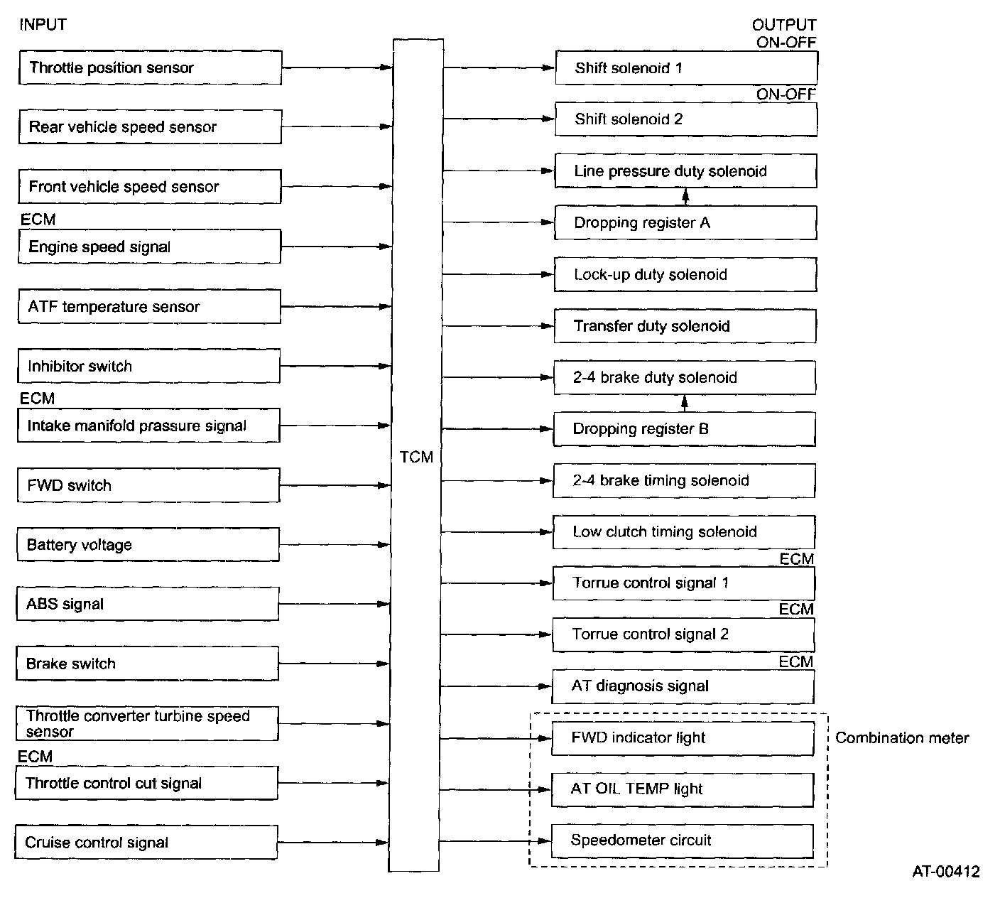 The TCM converts the signals into pulse signals and outputs them to both the Engine Control Module (ECM) and the combination meter.