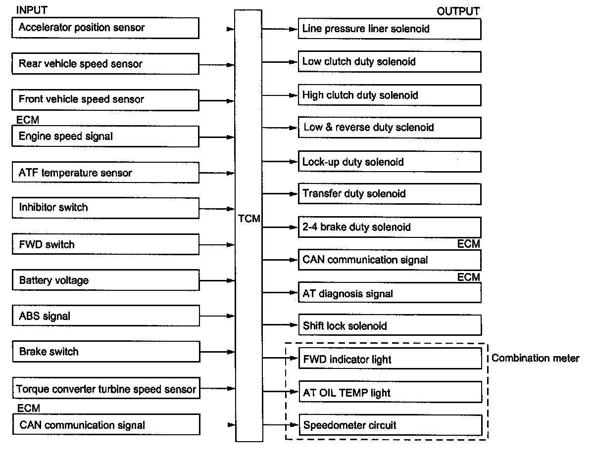 The electro-hydraulic control system for the transmission and transfer consists of various sensors and switches, a transmission control module (TCM) and the hydraulic controlling units including solenoid valves. The system controls the automatic transmission operation, including gear shifting, lockup clutch operation, line pressure, pilot pressure, pattern selection (BASE and POWER), and gear-shift timing. It also controls the operation of the transfer clutch. The TCU determines vehicle operating conditions from various input signals and controls a total of seven solenoids (line pressure linear solenoid, lockup duty solenoid, 2-4 brake duty solenoid, low clutch duty solenoid, high clutch duty solenoid, low & reverse clutch duty solenoid, and transfer duty solenoid) by sending appropriate signals to them.