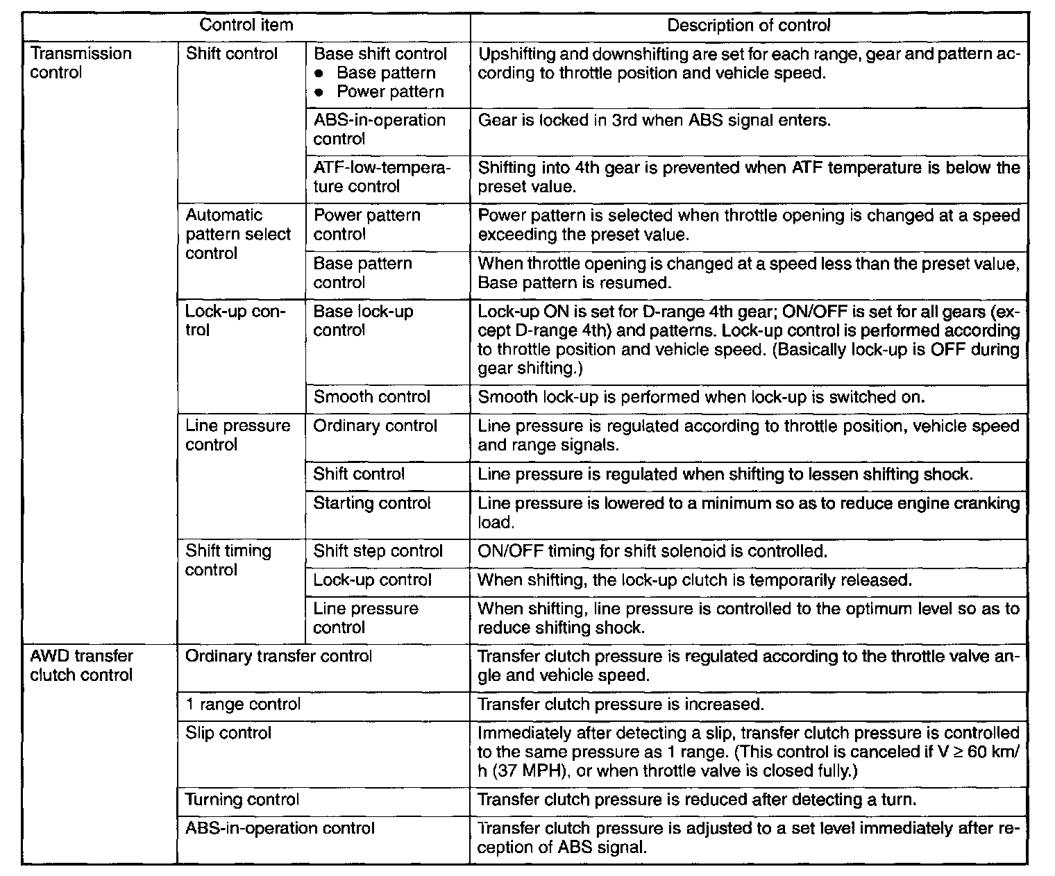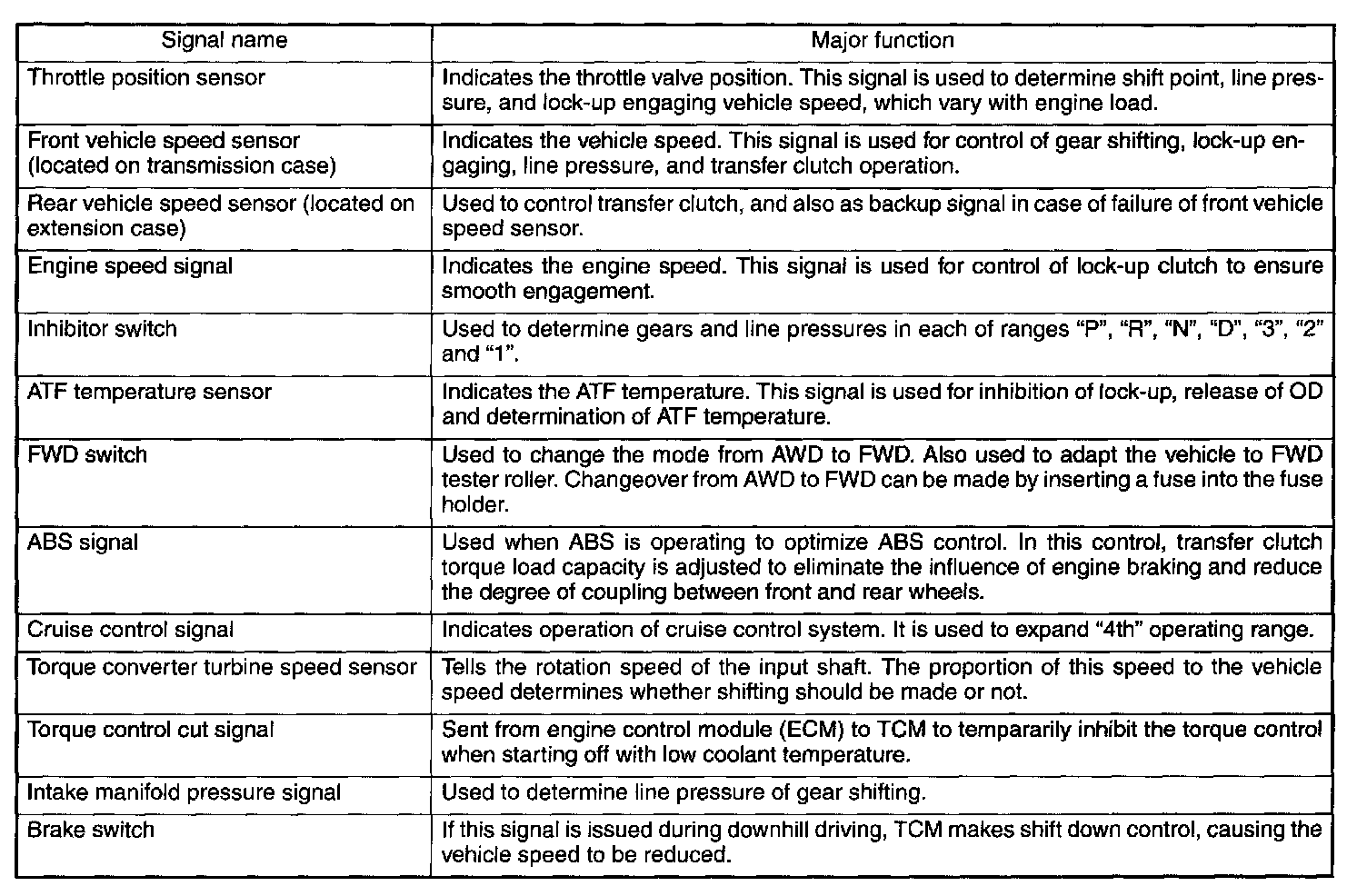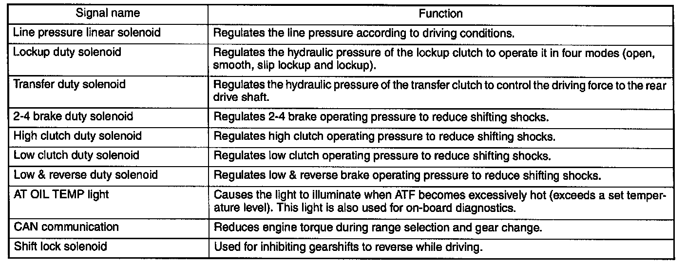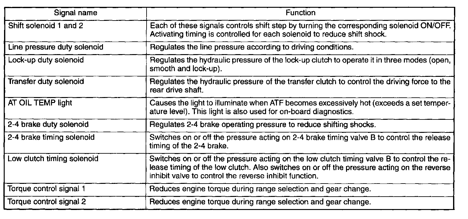 The electrohydraulic control system for the transmission and transfer consists of various sensors and switches, a transmission control module (TCM) and the hydraulic controlling units including solenoid valves. The system controls the automatic transmission operation, including gear shifting, lock-up clutch operation, line pressure, automatic control pattern selection ("Base" and "Power"), and gear-shift timing. It also controls the operation of the transfer clutch. The TCM determines vehicle operating conditions from various input signals and controls a total of eight solenoids (shift solenoids 1 and 2, low clutch timing solenoid, 2-4 brake timing solenoid, line pressure duty solenoid, lock-up duty solenoid, transfer duty solenoid, and 2-4 brake duty solenoid) by sending appropriate signals to them.