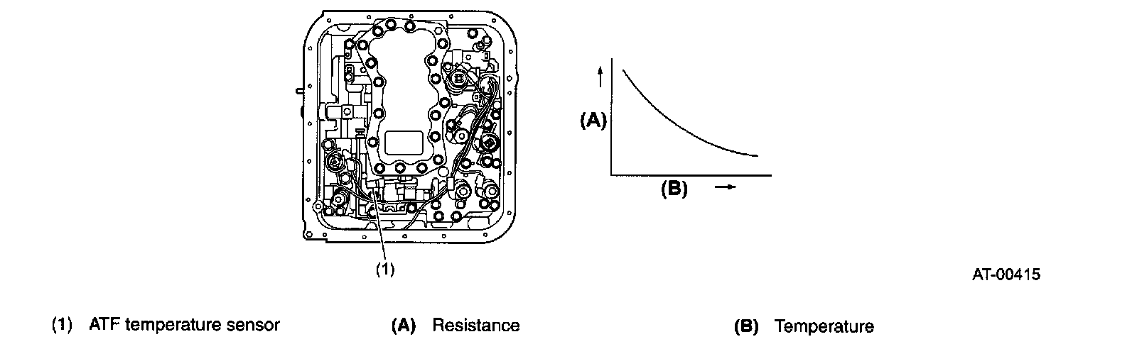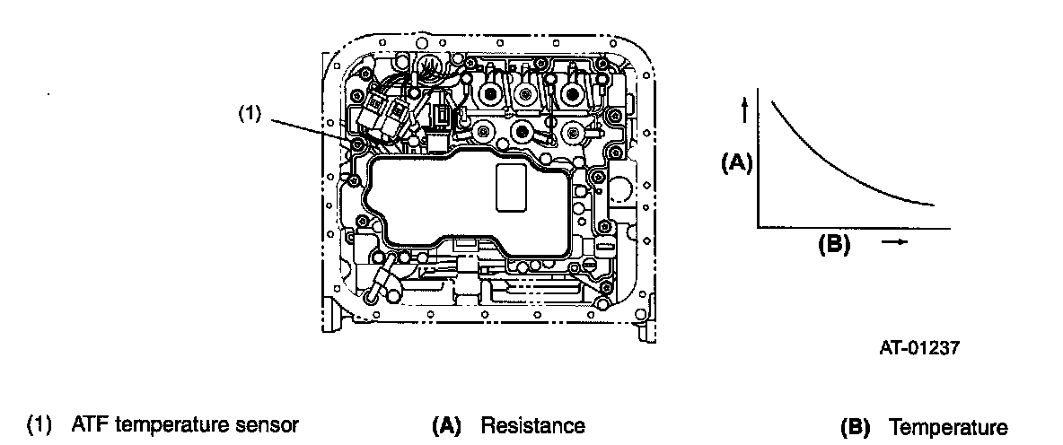 This sensor is mounted on the hydraulic control valve body of the transmission. It detects the temperature of ATF and outputs it as an electrical resistance signal. The output characteristics of the sensor are shown below.