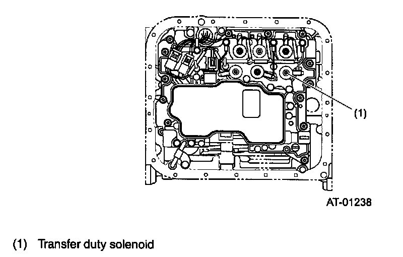 This solenoid is mounted on the transfer hydraulic pressure control unit on the rear end of transmission case. its duty ratio is controlled by signals from the TCM. It then controls the transfer clutch/ control valve to control the pressure applied to the transfer clutch.