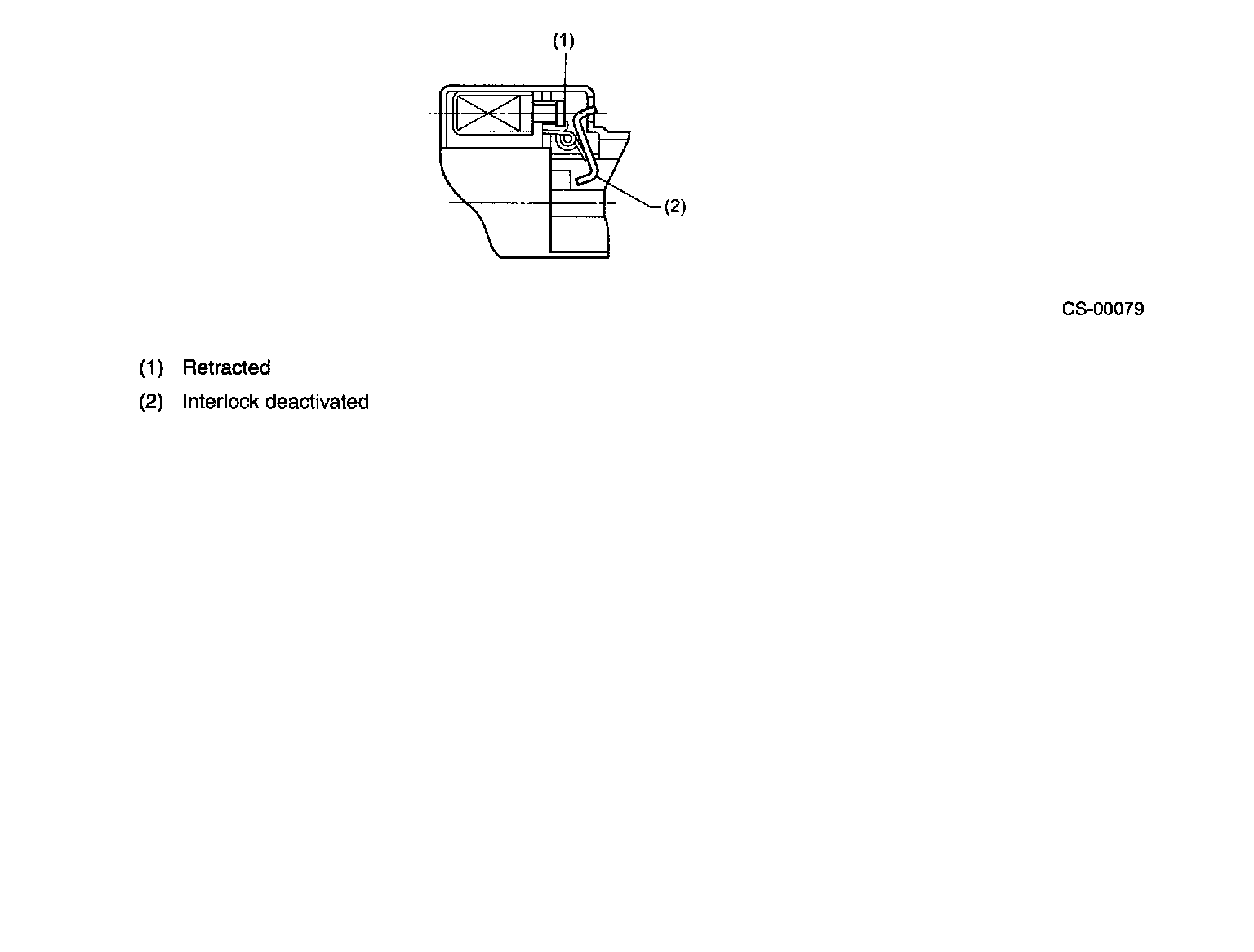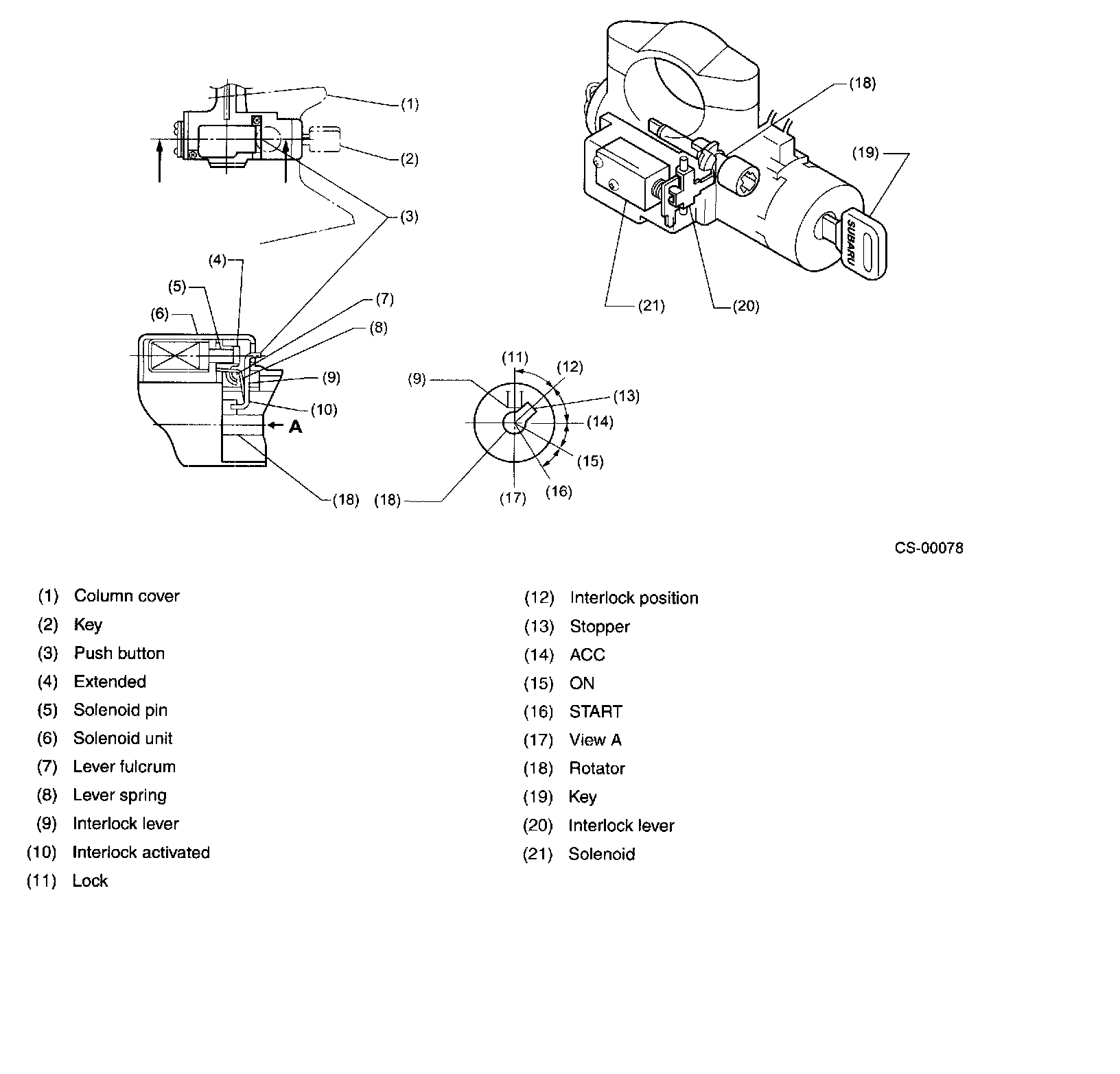 ^ When the select lever is at any position other than "P", the solenoid is energized and its pin is held extended. Being caused to stay in its upright position by extension of the pin, the interlock lever interferes with the stopper portion of the rotator which turns together with the ignition key. Thus, the ignition key cannot be rotated to the "LOCK" position.