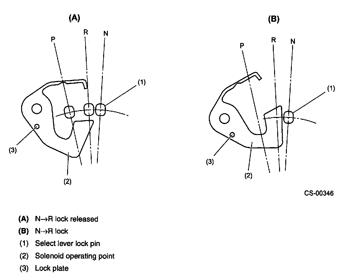 1) When the ignition switch is ON (select lever in N, D, 3, 2 or 1 range) and the vehicle speed is below 10 km/h (6.2 MPH), the solenoid is activated moving the lock plate to release the N-R lock, thus reverse speed can be selected.