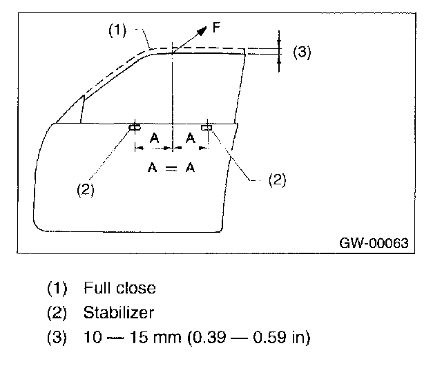 ADJUSTMENTNOTE: Before adjustment, ensure that all adjusting bolts of stabilizer, upper stopper, and sash are loose and door glass is raised so that it is in contact with weatherstrip.
