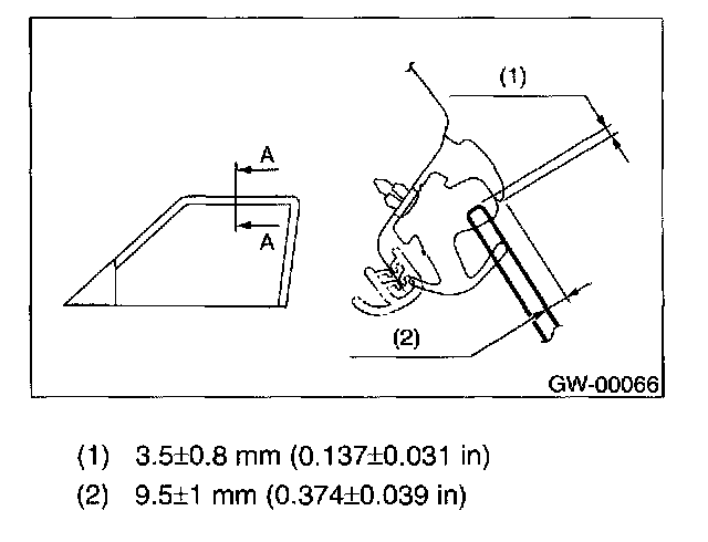 8. After stabilizer adjustment, carry out the glass crimp adjustment. First, visually ensure positional relationship between retainer & molding and glass of the roof side, and then begin with rear sash adjustment. Adjust two adjusting bolts alternately step by step to obtain dimensions shown(cross-section A)