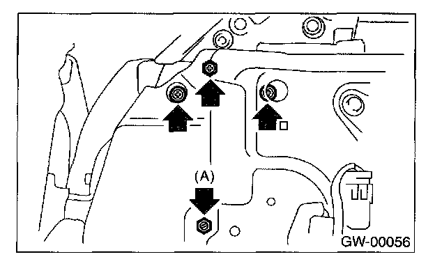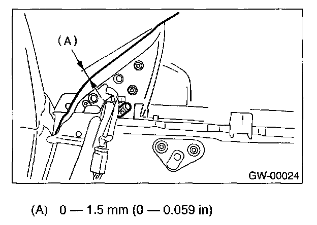 4. For adjustment of clearance between front glass and center pillar cover, loosen the nuts A., and move the rear sash back and forward until clearance becomes the value shown. (Clearance between upper side and lower side is within 15 mm (0.059 in).)