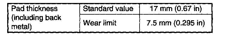 ^ A wear indicator is provided on the inner disc brake pad. If the pad wears down to such an extent that the end of the wear indicator contacts the disc rotor, a squeaking sound is produced as the wheel rotates. If this sound is heard, replace the pad.