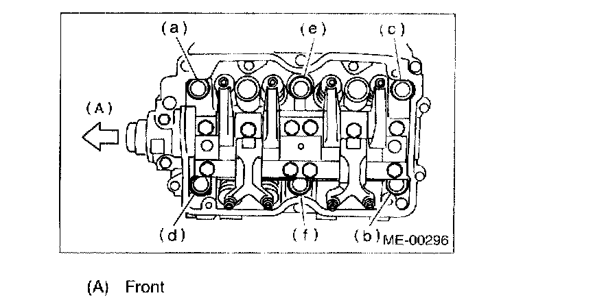 NOTE: Leave bolts (a) and (c) engaged by three or four threads to prevent cylinder head from falling.